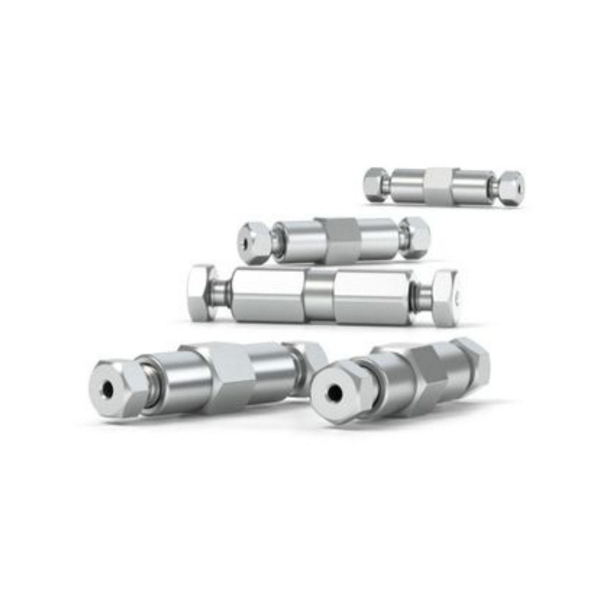 These very high pressure, zero-dead-volume (ZDV) unions are precision machined from 316 stainless steel, carefully passivated, then thoroughly rinsed. Each comes complete with stainless steel nuts and ferrules. It is supplied with fittings for 1/16 inches outer diameter or 1/8 inches outer diameter tubing. Union assemblies have a pressure rating of 20,000 psi (1,380 bar) or higher.